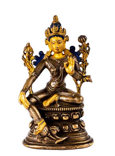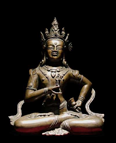 金剛手菩薩頭戴五骷髏冠,表五方佛的智慧威權(quán),右手執(zhí)金剛杵,表菩提心或堅(jiān)固不滅之佛性;右手執(zhí)捆魔鎖,有表空性之義。