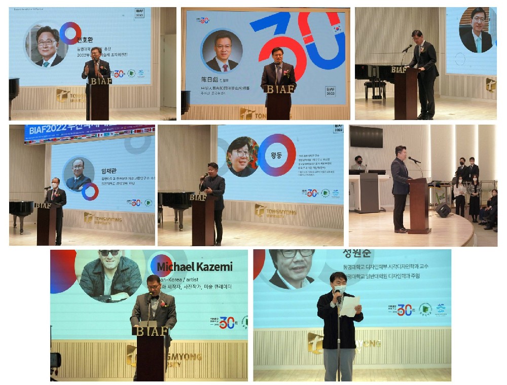 這次釜山國際藝術節(jié)首先由中韓藝術文化交流研究院院長兼東明大學經營學院院長???教授致歡迎詞,另外在開幕式上, 釜山國際藝術節(jié)組織委員長兼東明大學校長???先生和中華人民共和國駐釜山總領事陳日彪先生互贈書法作品,希望兩國之間有越來越多的藝術文化交流。圍繞"中韓建交30周年之后疫情時代的設計"主題分別為獲獎者們頒發(fā)了各類獎項。釜山國際藝術節(jié)總運營主席兼中國文化藝術促進會委員會副主任兼東明大學教授王東先生、伊朗電影制作Michael Kazemi先生、東明大學建筑設計學院院長???女士、韓國???女士和Kenneth May先生根據這次主題分別積極展開了學術討論等活動。