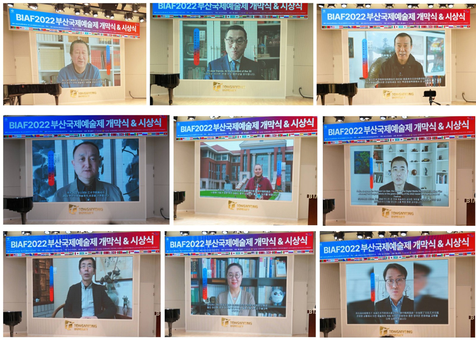 這次釜山國際藝術節(jié)得到了韓國市政府的大力支持,釜山國際藝術節(jié)總運營主席兼中國文化藝術促進會品牌藝術工作委員會副主任中國外駐機構負責人兼東明大學教授王東先先生首先祝賀釜山國際藝術節(jié)圓滿開幕,同時發(fā)來賀信的有全國政協外事委員會副主任兼察哈爾學會會長韓方明先生、韓國釜山市長???先生; 中國文化藝術促進會品牌藝術委員會會長和中國文化藝術促進會品牌藝術委員會(韓國釜山)工作委員會主任張銳鋒先生對藝術節(jié)表示了祝賀, 致賀詞的有釜山國際藝術節(jié)組織委員長兼東明大學校長???先生、中華人民共和國駐釜山總領事陳日彪先生、釜山國際交流財團事務總長???先生、伊朗電影制作者Michael Kazemi先生,通過視頻祝賀的有釜山市教育廳廳長???先生、中國文化藝術發(fā)展促進會會長湯曉陽先生、北京電影學院副校長孫立軍先生、國際動畫協會副主席李中秋先生、大連工業(yè)大學副校長任文東先生、河北美術學院副校長張建敏先生、南京傳媒學院副校長袁曉黎女士、北京電影學院數字媒體學院院長劉謙先生、天津美術學院產品設計學院院長蘭玉琪先生、吉林師范大學美術學院院長陳思女士、天津工業(yè)大學藝術學院教授陳昌先生。