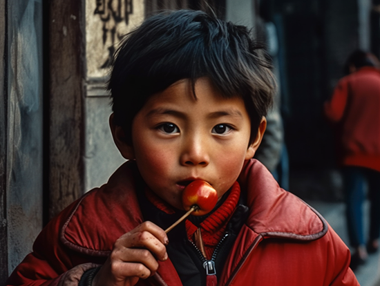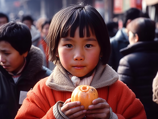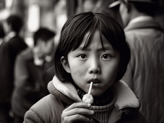 第?、調??師?格:例如在剛才輸?的關鍵詞中加?by Alex Webb,變成:中國80年代北京前 ?、街頭攝影、?個在吃冰糖葫蘆的?學?、by Alex Webb ,就會得到 Alex Webb?格攝影作品。Alex Webb是?位美國攝影師,以其富有鮮明視覺?格和復雜構圖?著名。他的作品經常以?度飽和的?彩和復雜的圖像構圖著稱,通過捕捉?物、環境、?化和社會之間的關系來探索?類?活的復雜性。我們會發現結果與原來不指定攝影師的時候?彩完全不同(圖?2)。如果我們請出戰地攝影之神羅伯特·卡帕by Robert Capa,就會變成戰地模式的??攝影作品(圖?3)。這就意味著,如果你對攝影?師的?格?夠了解,你就可以讓攝影?師變成你的掌機或攝影助理,根據你的想法讓?師來協助你進?創作。