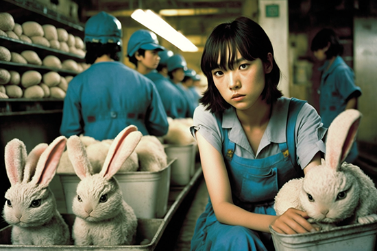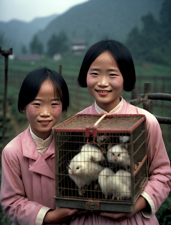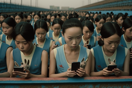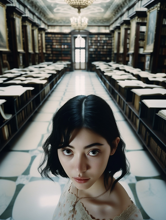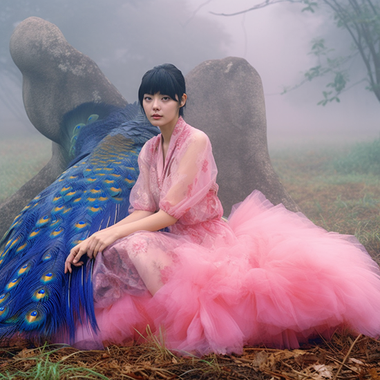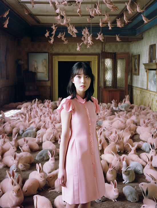第三、運?導演思維攝影:既然可以如此調??師來協助,AI攝影就可以運?導演思維來創作。導演需要調度場景、演員、服裝、造型、攝影、美術、燈光、演員、劇情、器材等。 那么AI攝影就可以在每個崗位上都調?明確的?師來幫你完成創作。注意,這?我們調?其他的專業的?師來參與拍攝也是可以的實現的。筆者曾在《兔籠?孩》之粉??暴的系列中,調?了建筑攝影師??莫·李斯特?by Massimo Listri來做場景設計,因為他拍攝過歐洲拍攝3500余座宮殿、歷史建筑。調?安德烈亞斯·古爾斯基by Andreas Gursky來讓兔?變成陣列的構成,因為他擅?拍攝消費主義下陣列擺放的物品。調?英國時尚攝影師蒂姆·沃克by Tim Walker,因為題材是超現實?由賦予時尚感的?像攝影,他是以其神奇的想象?和奇妙的視覺效果?著名。筆者選擇了ARRI這臺拍攝電影的攝像機,設置好快?和光圈等參數。同時,選擇了拍攝?度,以及控制了?物的姿勢和表情,服裝?彩設定為粉紅?。于是就出現了(圖?4)的作品。 由于筆者從事了多年的導演?作,所以對這套導演?作流程?常熟悉。當然對服裝進?品牌、材質的也明確要求,也完全可以實現。這種導演式的創作的?式,在傳統的攝影創作中會耗費?量的??物?,?更不可能把三位重量級的不同領域的?師集中到?起為??創作所?。因此導演思維的創作思路是“想照?Think Photo”階段在創作上的另?個構?。讓?師變成你各個崗位上的得?助?,所有的局限只會是創作者的想象?。