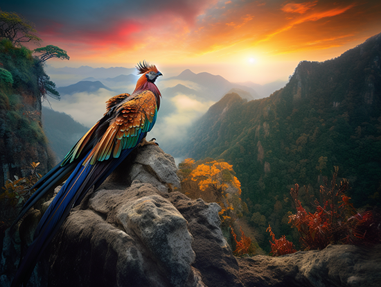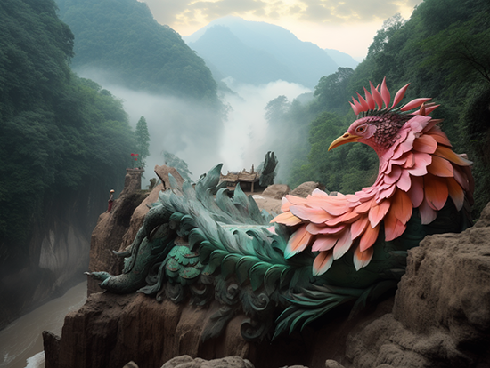 第四、使?意念來創作:如果我們不想?關鍵詞去描述,其實可以通過?然語?來創作,你描述出 ?種意境、?句詩或者?個夢境,通過AI預訓練模型的轉譯變成繪圖Ai可以聽得懂的提示語。筆者通過訓練AI去閱讀???的《?游記》原?,將???的《?游記》中對于花果?的描述?段讓文字AI轉譯為 繪圖AI可以讀懂的提示語,特別注意的是???的《?游記》中對花果?的描述是使?詩歌的?式來描繪的,同時筆者加?了攝影師的選擇和上傳了?張抽象的圖?作為?彩參考,創作出了《?游記》系列的AI場景(圖5)。也 就意味著這是?張?詩歌拍出來的照?。?格的控制和?彩的給定則是創作者有意為之的,我們可以對??下如果不給?格限定,則會出現(圖6)的圖 像,沒有?格和情緒的表達。因此,這是?種?機協同的創作?式。由此也可以發散和創新出許多新的創作?式。